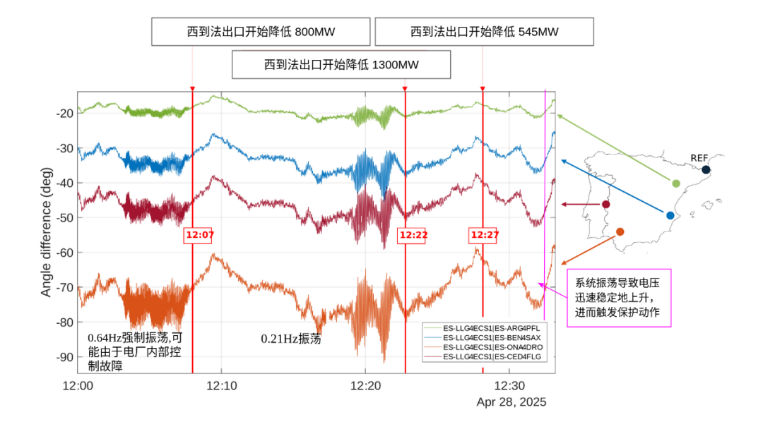 第1階段“系統(tǒng)中的電壓與振蕩”:4月28日12:00-12:30期間,電壓異常升高,進(jìn)而觸發(fā)了頻率的快速下降,隨后產(chǎn)生系統(tǒng)級別的振蕩(指電力系統(tǒng)中電壓、頻率等各個變量出現(xiàn)不穩(wěn)定的振蕩現(xiàn)象)。12點03分,記錄到0.64Hz的非典型振蕩(有專家指出由光伏電站引起的強(qiáng)制振蕩,可能是由于內(nèi)部控制故障造成的),持續(xù)4.42分鐘,引起了較大的電壓波動。這種振蕩迫使系統(tǒng)運(yùn)營商采取協(xié)議措施,增強(qiáng)電網(wǎng)的網(wǎng)狀結(jié)構(gòu)(也就是重新連接10條400kV線路)或減少對法國的電力輸送。所有這些動作抑制了振蕩,但也產(chǎn)生電壓增加的副作用,使得穩(wěn)定電壓的難度增大。12點16分,再次記錄到相同的振蕩,規(guī)模較小。12點19分時,強(qiáng)迫振蕩以較小幅度激發(fā)了頻率為0.21Hz的東西中區(qū)域間振蕩模式,該模式體現(xiàn)了歐洲電網(wǎng)的典型特性。系統(tǒng)操作員采用相同的措施來緩沖,也使得電壓增加。此外,與法國的高壓直流連接的聯(lián)絡(luò)線也改為固定功率模式,出口減少到1000兆瓦,這對抑制振蕩具有顯著效果。但是這樣做的一個副作用是,即使西班牙在多次發(fā)電中斷后出現(xiàn)巨大電力缺口,也無法改變對法國出口變化。為了恢復(fù)電壓,在振蕩過程中電壓瞬時降至較低值時,采取了并聯(lián)電抗器的操作措施。