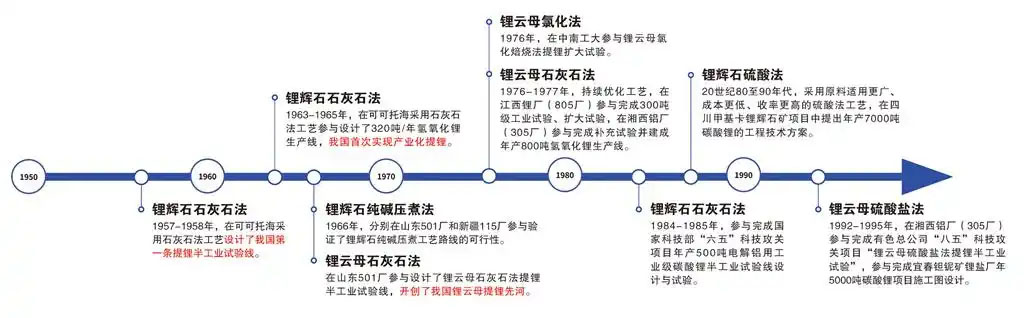 可可托海三號礦坑是著名的共和國“功勛礦”,出產(chǎn)我國已知170多種有用礦物中的80多種,曾為工業(yè)發(fā)展提供了珍貴原料。中國恩菲作為國內(nèi)較早參與鋰資源開發(fā)、研究、咨詢和設(shè)計的單位,深度參與了可可托海的技術(shù)研發(fā)和工程設(shè)計工作,在那里打下了我國鋰輝石提鋰技術(shù)的堅實基礎(chǔ)。20世紀50年代,中國恩菲以可可托海產(chǎn)出的鋰輝石為原料,采用石灰石法工藝設(shè)計了我國第一條提鋰半工業(yè)試驗線,掀開了我國鋰工業(yè)發(fā)展的篇章。20世紀60至90年代,通過持續(xù)探索開發(fā)鋰礦石資源提取工藝,中國恩菲和行業(yè)企業(yè)一道,完成了鋰輝石石灰石法、純堿壓煮法、硫酸法,鋰云母石灰石法、氯化焙燒法、硫酸鹽法等礦石提鋰工藝的試驗檢驗和工程化論證。其中,鋰輝石硫酸法工藝和鋰云母硫酸鹽法工藝為我國鋰鹽產(chǎn)業(yè)的規(guī)模化發(fā)展奠定了重要基礎(chǔ)。