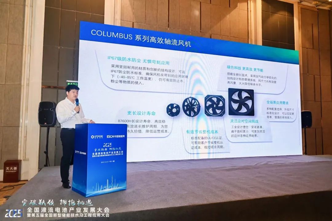 7月24日,Regal Rexnord能效解決方案事業(yè)部亞太區(qū)儲能行業(yè)經(jīng)理陳杰在《電化學(xué)儲能技術(shù)專場》分論壇發(fā)表了重要技術(shù)演講——《聚焦能效挑戰(zhàn) 為儲能應(yīng)用而生:Columbus系列高效軸流風(fēng)機解決方案》,就儲能行業(yè)市場趨勢、客戶需求的變化展開分享,并重點介紹了旗下風(fēng)機行業(yè)“隱形冠軍”品牌NICOTRA | Gebhardt® Columbus系列高效軸流風(fēng)機解決方案,與現(xiàn)場嘉賓深入探討。