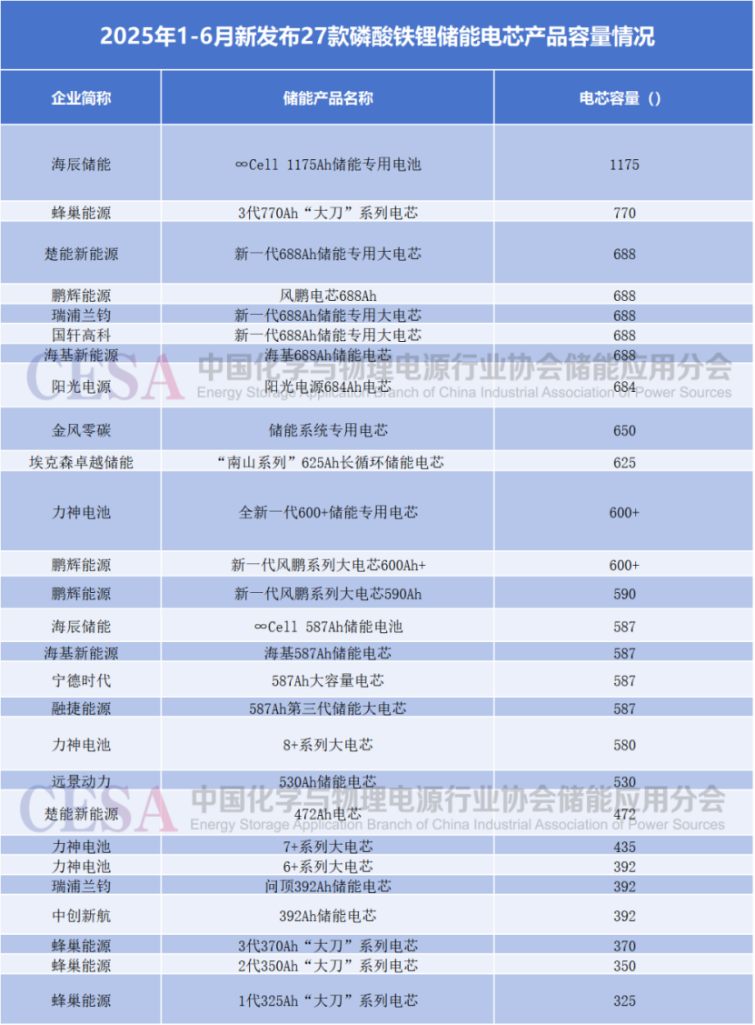 據(jù)CESA儲(chǔ)能應(yīng)用分會(huì)產(chǎn)業(yè)數(shù)據(jù)庫(kù)不完全統(tǒng)計(jì),2025年1-6月新發(fā)布的27款儲(chǔ)能專用電芯中,600Ah及以上容量產(chǎn)品達(dá)17款,占比63%,最高容量達(dá)1175Ah,較2024年主流產(chǎn)品實(shí)現(xiàn)翻倍式跨越,印證"大電芯時(shí)代"已全面到來(lái)。