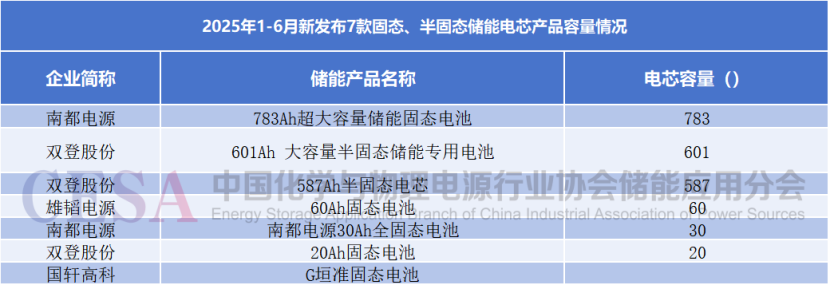 2025年1月至6月期間,儲(chǔ)能行業(yè)共推出七款固態(tài)及半固態(tài)儲(chǔ)能電芯產(chǎn)品,涵蓋多個(gè)技術(shù)路線與應(yīng)用場(chǎng)景,展現(xiàn)出行業(yè)在電芯容量突破與技術(shù)迭代上的顯著進(jìn)展。南都電源率先發(fā)布兩款產(chǎn)品,其中"783Ah固態(tài)電池"以783Ah的容量創(chuàng)下同期最高紀(jì)錄,彰顯其在大型儲(chǔ)能領(lǐng)域的技術(shù)實(shí)力;另一款"30Ah全固態(tài)電池"則聚焦小型化場(chǎng)景,形成高低搭配的產(chǎn)品矩陣。