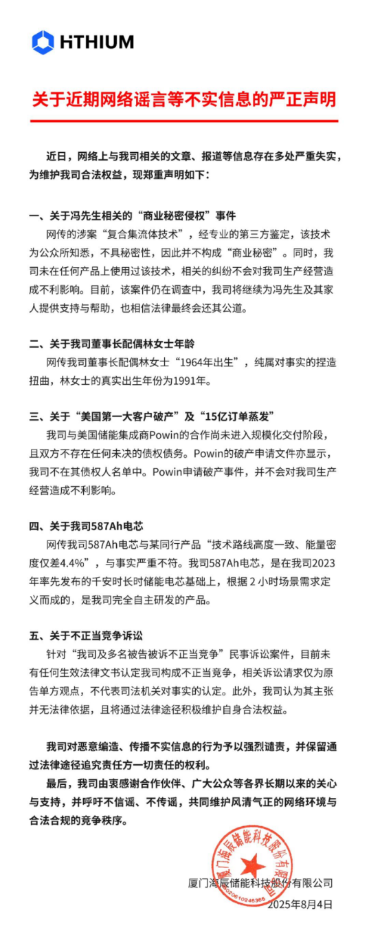 8月4日晚間,海辰儲能通過官方渠道發(fā)布《關(guān)于近期網(wǎng)絡(luò)謠言等不實(shí)信息的嚴(yán)正聲明》,針對“商業(yè)秘密侵權(quán)”“美國第一大客戶破產(chǎn)”“不正當(dāng)競爭訴訟”等五大網(wǎng)絡(luò)謠言逐一辟謠,強(qiáng)調(diào)涉案技術(shù)不具秘密性、訂單未受影響,并重申587Ah電芯為自主研發(fā)產(chǎn)品。