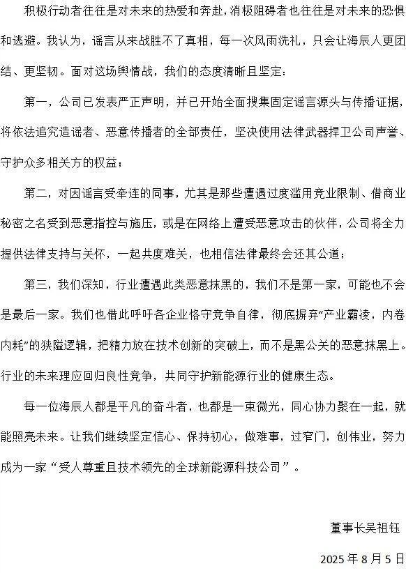 聲明發(fā)布僅24小時(shí)后,8月5日晚間,海辰儲能創(chuàng)始人、董事長吳祖鈺(Jeff)向全體員工群發(fā)《致全體海辰人的一封信》,以“我們不惹事,也不怕事”的強(qiáng)硬態(tài)度,回應(yīng)近期輿情攻擊。