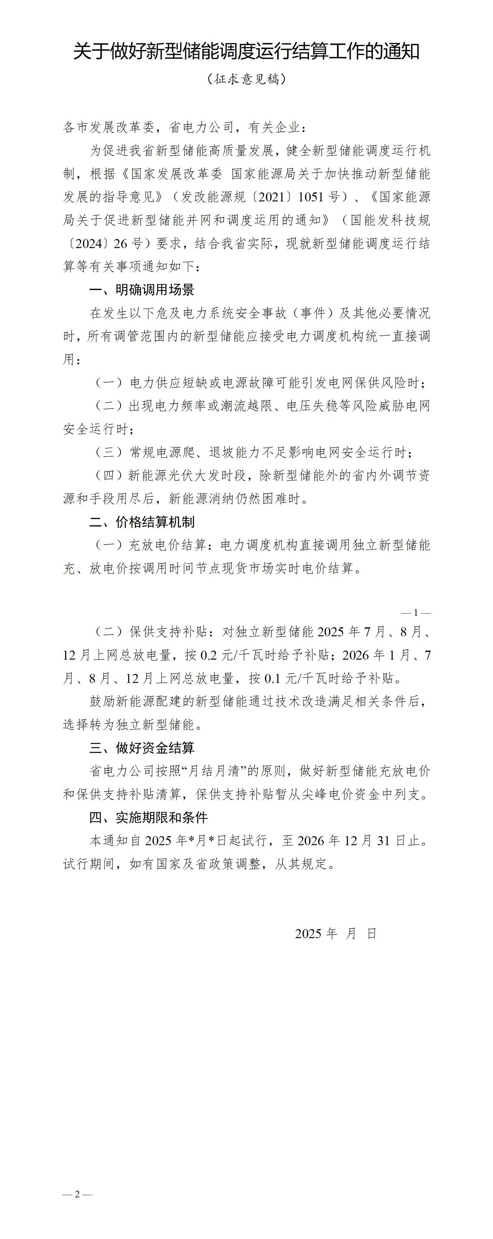 為促進我省新型儲能高質量發(fā)展,健全新型儲能調度運行機制,省能源局根據《國家發(fā)展改革委 國家能源局關于加快推動新型儲能發(fā)展的指導意見》(發(fā)改能源規(guī)〔2021〕1051號)、《國家能源局關于促進新型儲能并網和調度運用的通知》(國能發(fā)科技規(guī)〔2024〕26號)要求,結合我省實際,組織起草了《關于做好新型儲能調度運行結算工作的通知(征求意見稿)》?,F予以公告,向社會公開征求意見。歡迎社會各界人士提出意見建議。
