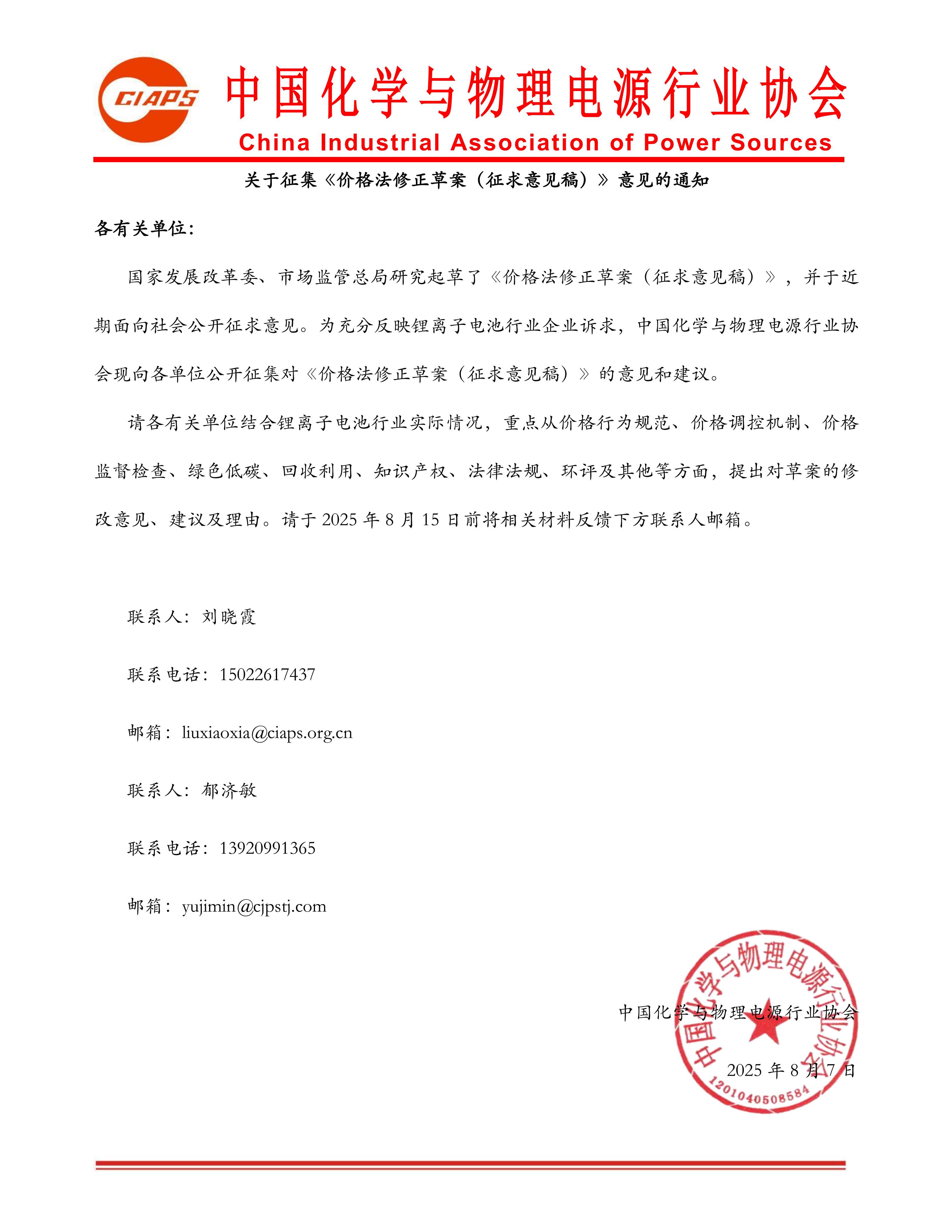 請各有關單位結合鋰離子電池行業(yè)實際情況,重點從價格行為規(guī)范、價格調(diào)控機制、價格監(jiān)督檢查、綠色低碳、回收利用、知識產(chǎn)權、法律法規(guī)、環(huán)評及其他等方面,提出對草案的修改意見、建議及理由。請于2025年8月15日前將相關材料反饋至下方聯(lián)系人郵箱。