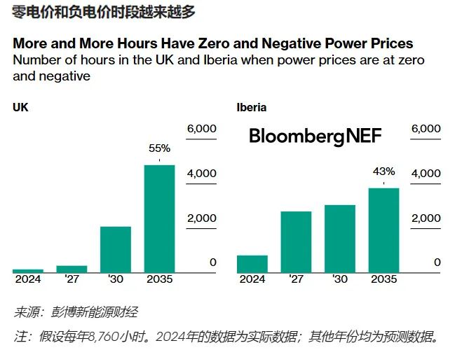 英國和伊比利亞半島是兩個(gè)光伏和風(fēng)電滲透率極高的市場(chǎng)。到2035年,可再生能源將占這些地區(qū)發(fā)電量的80%以上,從而推高棄電率。彭博新能源財(cái)經(jīng)估計(jì),英國每年零電價(jià)或負(fù)電價(jià)小時(shí)數(shù)將從2024年的157小時(shí)增至近4,900小時(shí),占全年8,760小時(shí)的55%。在伊比利亞半島,2035年將有3,800小時(shí)零電價(jià)或負(fù)電價(jià),而去年只有800小時(shí)。