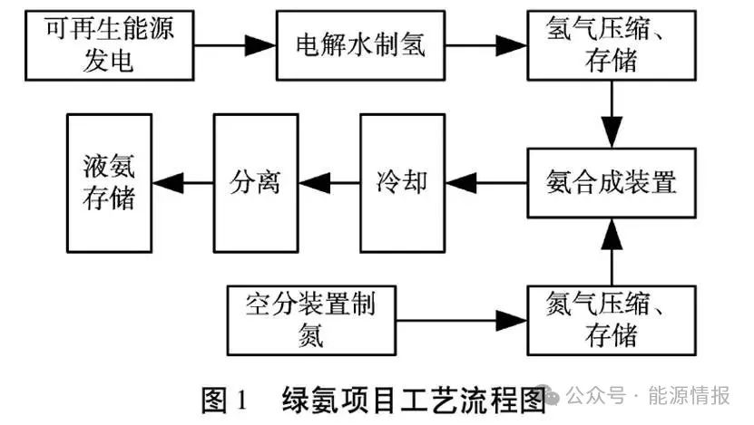 綠氨生產(chǎn)的核心環(huán)節(jié)包括綠氫制備、氮?dú)庵苽浜秃铣砂?。其中,綠氫制備主要通過(guò)電解水制得,氮?dú)鈩t通過(guò)空氣分離設(shè)備從空氣中提取。合成氨環(huán)節(jié)則采用傳統(tǒng)的Haber-Bosch法或其他改進(jìn)工藝。具體見圖1。