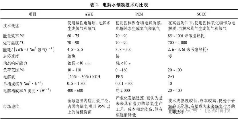 綠氫是指利用可再生能源(如風(fēng)能、水能、太陽(yáng)能等)通過(guò)電解水技術(shù)制得的氫氣,這一過(guò)程中不產(chǎn)生二氧化碳,從源頭上實(shí)現(xiàn)了二氧化碳的零排放。目前堿性電解水制氫(AWE)、質(zhì)子交換膜電解水制氫(PEMWE)、固體氧化物電解水制氫(SOEC)是三種電解水制氫的主流工藝。技術(shù)對(duì)比見表2。