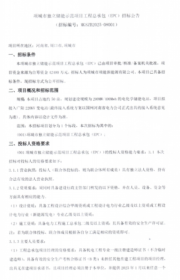 中國儲能網(wǎng)訊:8月7日,項城市項能新能源有限公司發(fā)布項城市獨立儲能示范項目工程總承包(EPC)招標(biāo)公告。項目位于河南省周口市項城市,項目資金來源為自籌資金42400萬元,折合單價1.06元/Wh。
