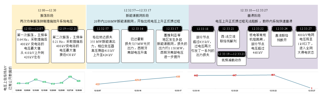 12:33:24,半島電網(wǎng)崩潰,西班牙和法國之間的高壓直流輸電線路停止運(yùn)行;12:33:27,400kV電網(wǎng)電壓降至1kV以下,半島進(jìn)入全網(wǎng)大停電狀態(tài)。
