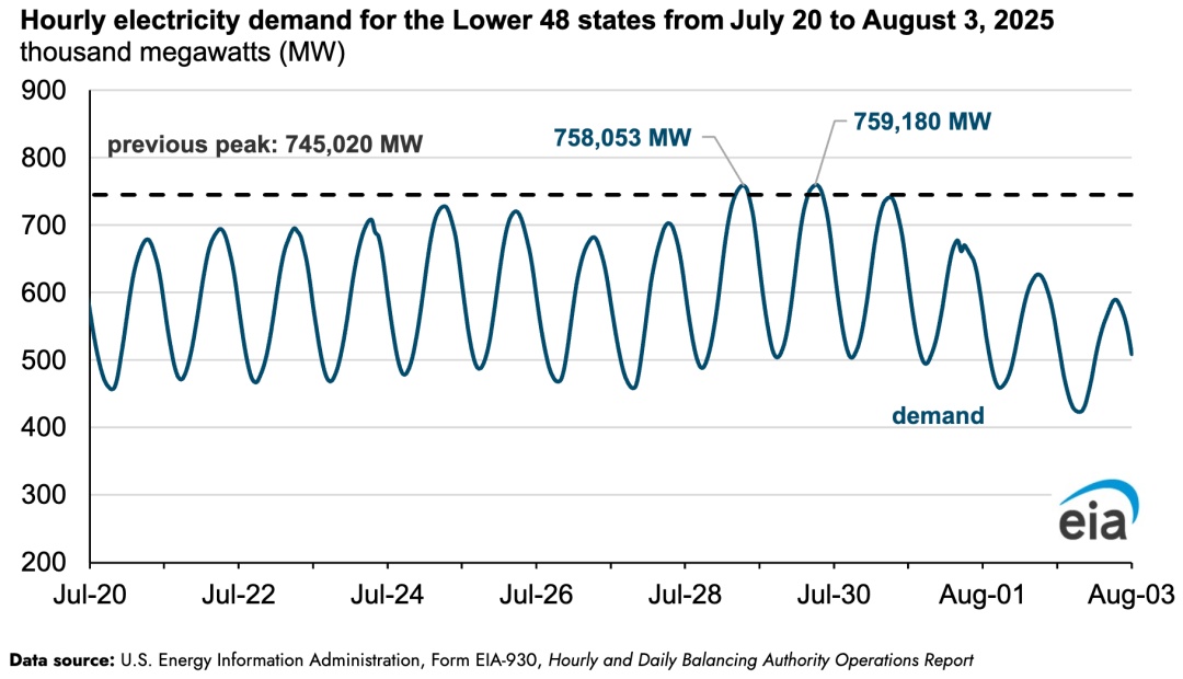 炎熱天氣(推高制冷用電需求)疊加電力需求本身的持續(xù)增長,使得本土48州的“同時峰值需求”于東部時間7月28日18:00-19:00達到758,053兆瓦(MW),創(chuàng)下新高。次日(7月29日),峰值需求再次刷新紀(jì)錄,達到759,180 MW,比2024年7月15日創(chuàng)下的745,020 MW原紀(jì)錄還高1.9%。