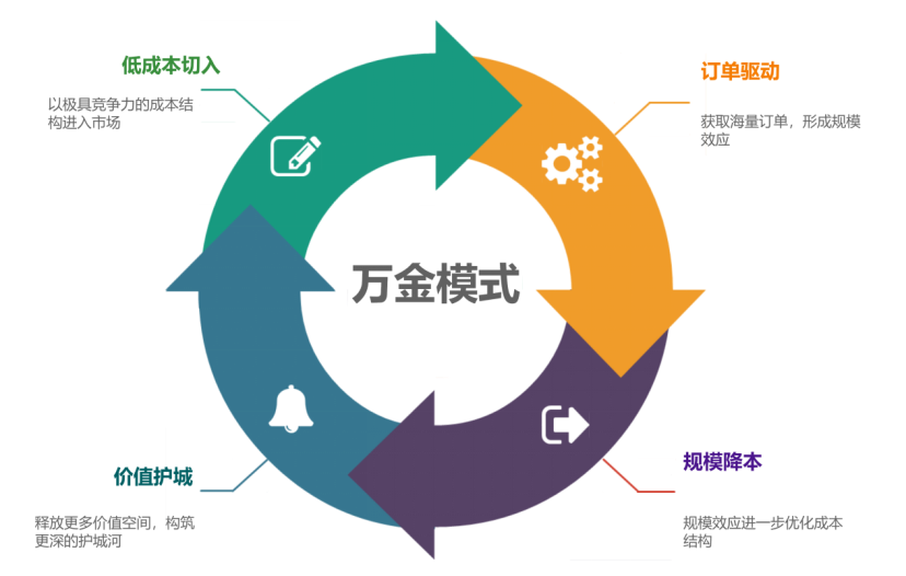 而萬(wàn)金的模式,是一場(chǎng)正向的價(jià)值創(chuàng)造循環(huán):以極具競(jìng)爭(zhēng)力的成本結(jié)構(gòu)進(jìn)入市場(chǎng)-> 獲取海量訂單,形成規(guī)模效應(yīng) -> 規(guī)模效應(yīng)進(jìn)一步優(yōu)化成本結(jié)構(gòu) -> 釋放更多價(jià)值空間,構(gòu)筑更深的護(hù)城河。
