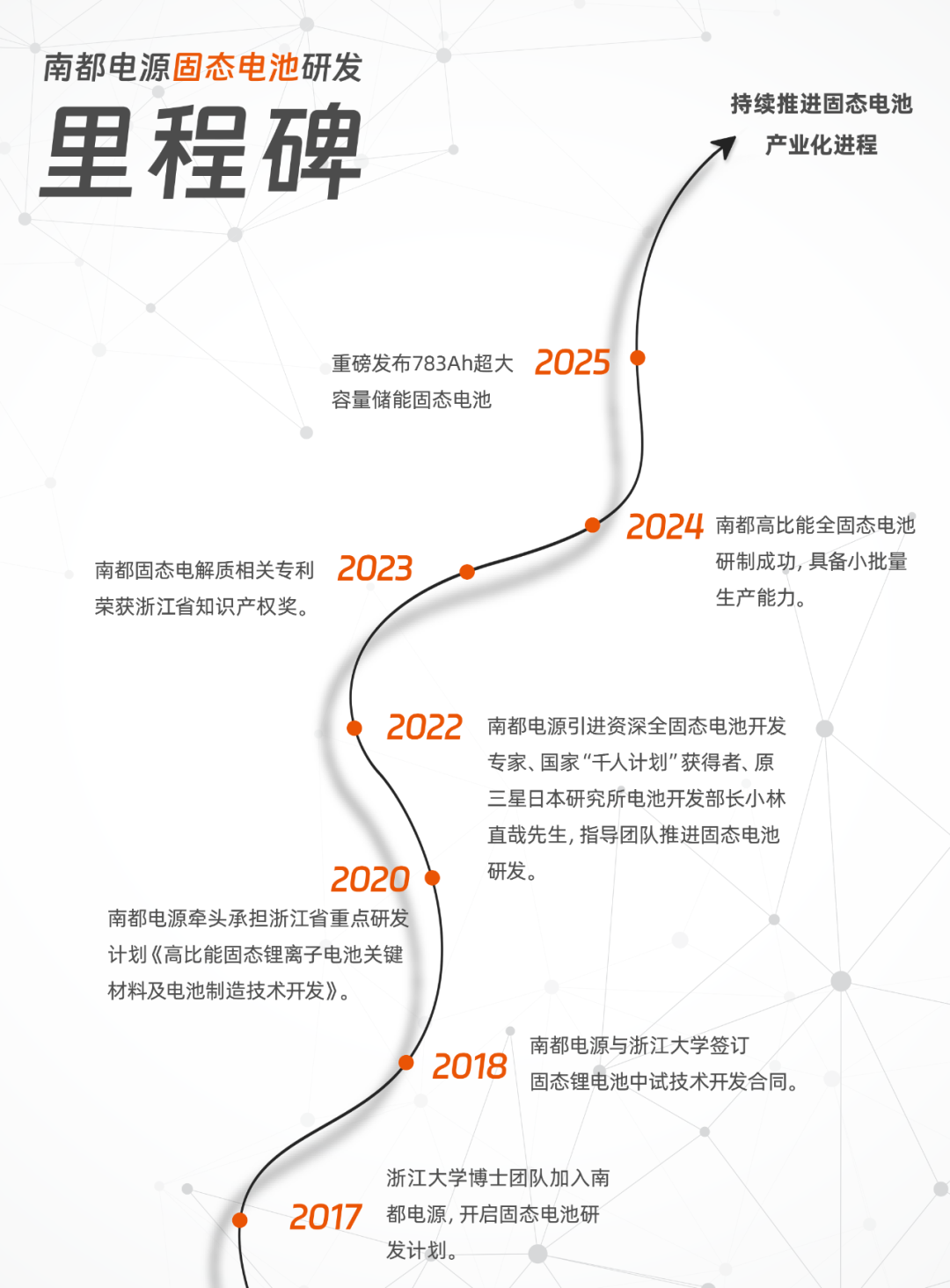 一直以來,南都電源以“研發(fā)一代、儲(chǔ)備一代”作為技術(shù)發(fā)展戰(zhàn)略,持續(xù)開展前瞻性研究。公司自2017年展開固態(tài)電池研制工作,是國內(nèi)最早布局固態(tài)電池的企業(yè)之一。