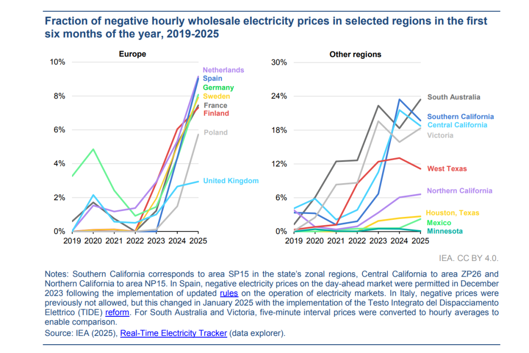 在歐洲,負(fù)電價(jià)的情況正變得越來越普遍。上半年,在德國(guó)、荷蘭和西班牙等國(guó),批發(fā)市場(chǎng)上的負(fù)電價(jià)時(shí)段占比達(dá)到了8%-9%,高于2024年的4% -5%。