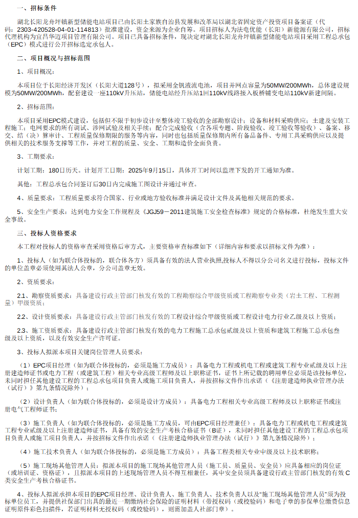 湖北長陽龍舟坪鎮(zhèn)新型儲能電站項目EPC招標(biāo)公告