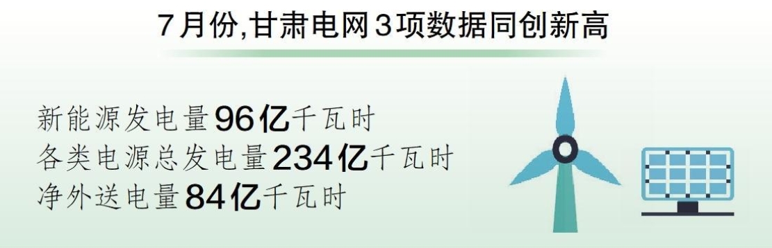 中國儲能網訊:8月1日,經國網甘肅省電力公司統(tǒng)計,7月份甘肅電網新能源發(fā)電量96億千瓦時,首次超90億千瓦時;各類電源總發(fā)電量234億千瓦時,同比增加4.46%;凈外送電量84億千瓦時,同比增加23.53%,3項數(shù)據(jù)同創(chuàng)新高。