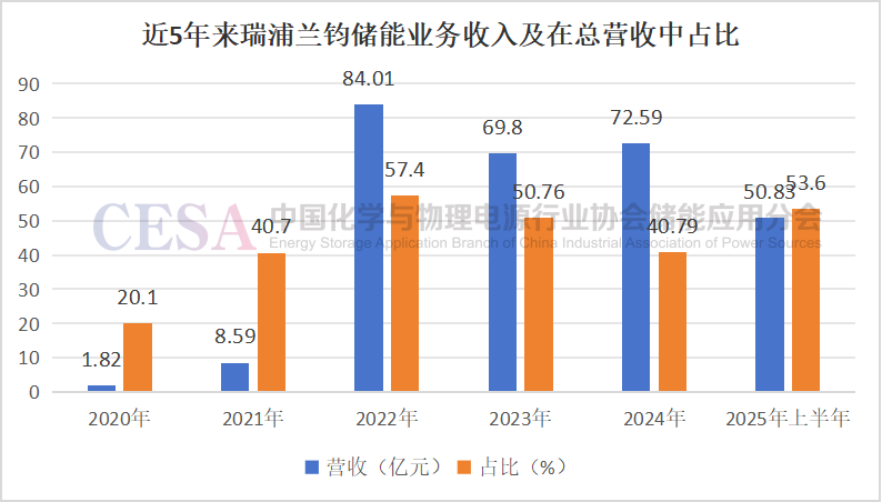 2025年上半年財報顯示,瑞浦蘭鈞儲能電池出貨18.87GWh,同比增長約119.3%,對應(yīng)收入50.83億元,占比升至53.6%,超越動力電池成為第一大收入來源。