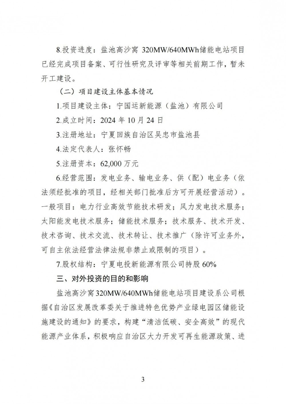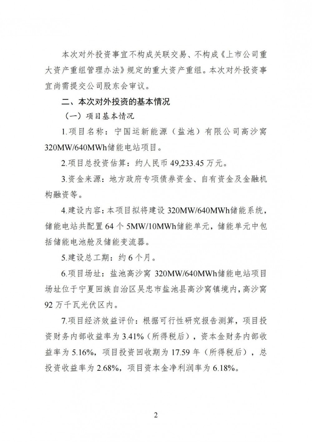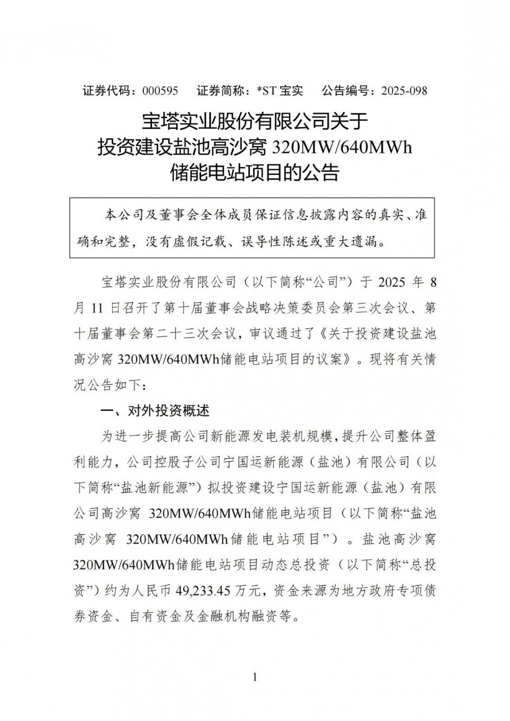 中國儲(chǔ)能網(wǎng)訊:8月12日,寶塔實(shí)業(yè)發(fā)布公告稱,為進(jìn)一步提高公司新能源發(fā)電裝機(jī)規(guī)模,提升公司整體盈利能力,公司控股子公司寧國運(yùn)新能源(鹽池)有限公司擬投資建設(shè)寧國運(yùn)新能源(鹽池)有限公司高沙窩320MW/640MWh儲(chǔ)能電站項(xiàng)目。鹽池高沙窩320MW/640MWh儲(chǔ)能電站項(xiàng)目動(dòng)態(tài)總投資(以下簡稱“總投資”)約為人民幣49,233.45萬元,資金來源為地方政府專項(xiàng)債券資金、自有資金及金融機(jī)構(gòu)融資等。