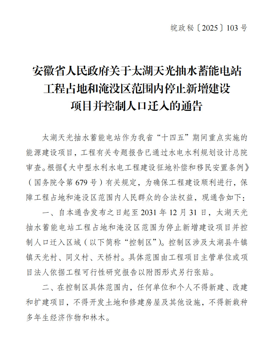 2025年8月11日,安徽省人民政府印發(fā)通告,要求在太湖天光抽水蓄能電站工程占地和淹沒區(qū)范圍內(nèi)停止新增建設項目、控制人口遷入規(guī)模,此舉標志項目進入征地移民實質(zhì)階段,為后續(xù)建設鋪路。