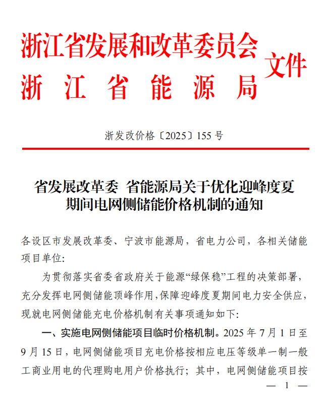 中國儲能網訊:8月13日,浙江省發(fā)改委發(fā)布《省發(fā)展改革委省能源局關于優(yōu)化迎峰度夏期間電網側儲能價格機制的通知》。其中提出,2025年7月1日至9月15日,電網側儲能項目充電價格按相應電壓等級單一制一般工商業(yè)用電的代理購電用戶價格執(zhí)行;在?般工商業(yè)電價非低谷時段充電的,充電價格都按低谷時段價格執(zhí)行。
