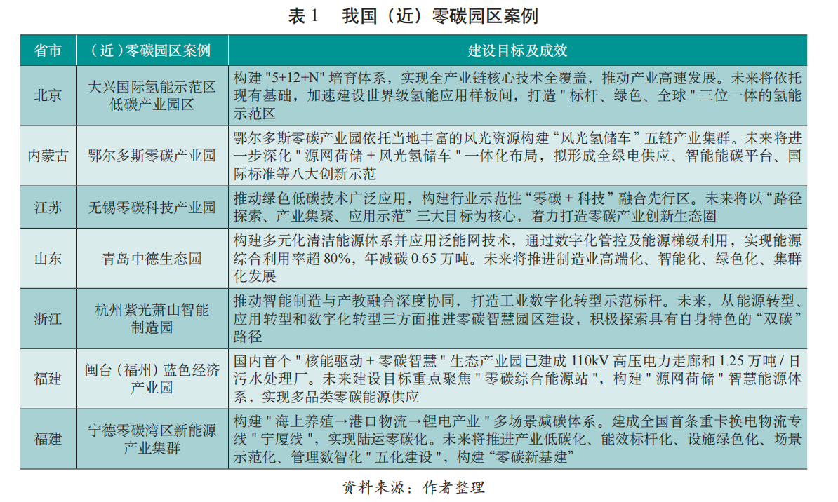 2020年隨著我國“雙碳”目標(biāo)的提出,零碳園區(qū)建設(shè)從理念轉(zhuǎn)向?qū)嵺`。2021年,國務(wù)院印發(fā)《2030年前碳達(dá)峰行動方案》首次明確園區(qū)低碳轉(zhuǎn)型方向;2022年,科技部印發(fā)《“十四五”國家高新技術(shù)產(chǎn)業(yè)開發(fā)區(qū)發(fā)展規(guī)劃》,進(jìn)一步鼓勵建設(shè)低碳產(chǎn)業(yè)園區(qū),推動綠色技術(shù)與低碳產(chǎn)業(yè)深度融合。在政策引導(dǎo)下,全國多地發(fā)布(近)零碳園區(qū)建設(shè)指南并積極推進(jìn)試點工作(見表1)。典型案例包括鄂爾多斯零碳產(chǎn)業(yè)園,其“風(fēng)光氫儲車”一體化系統(tǒng)實現(xiàn)80%綠電直供,吸引多家頭部企業(yè)入駐;北京大興國際氫能示范區(qū)全面向全球引入氫能創(chuàng)新產(chǎn)業(yè),打造具有國際影響力的氫能科技成果轉(zhuǎn)化示范基地。