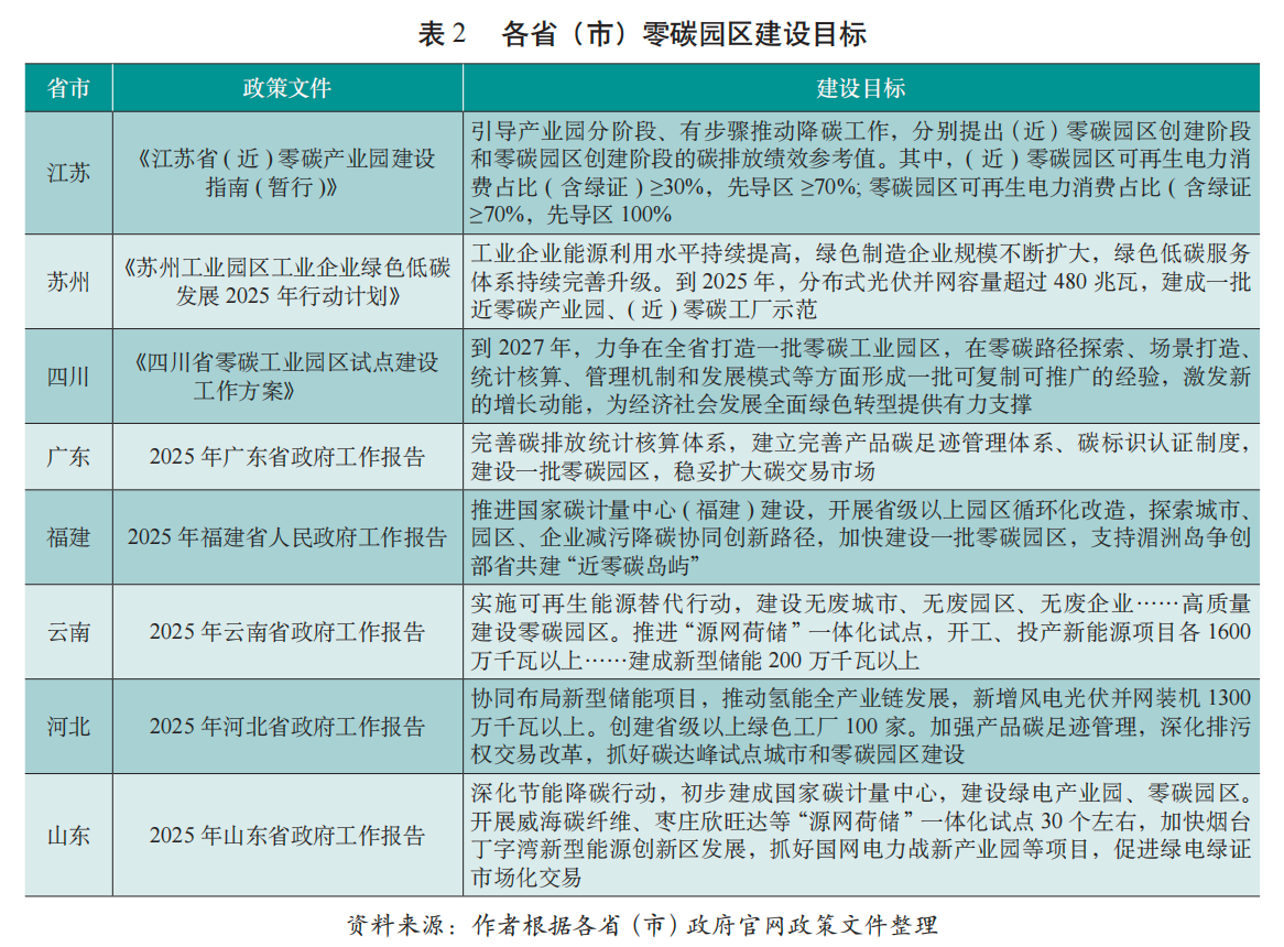 作為零碳園區(qū)建設(shè)的“政策元年”,2025年全國“兩會”上明確提出構(gòu)建“能源零碳化、產(chǎn)業(yè)低碳化、管理數(shù)智化”的總體框架,出臺零碳園區(qū)建設(shè)方案,推進(jìn)零碳園區(qū)、社區(qū)、鄉(xiāng)村同步發(fā)展。《零碳園區(qū)評價技術(shù)規(guī)范》(T/CECA-G 0344-2025)同期發(fā)布,首次提出涵蓋碳核算、清潔能源比例、循環(huán)經(jīng)濟(jì)等七大維度的評價體系,標(biāo)志著園區(qū)建設(shè)進(jìn)入精細(xì)化治理階段。各地政府積極響應(yīng),結(jié)合區(qū)域特色推進(jìn)轉(zhuǎn)型升級(見表2)。