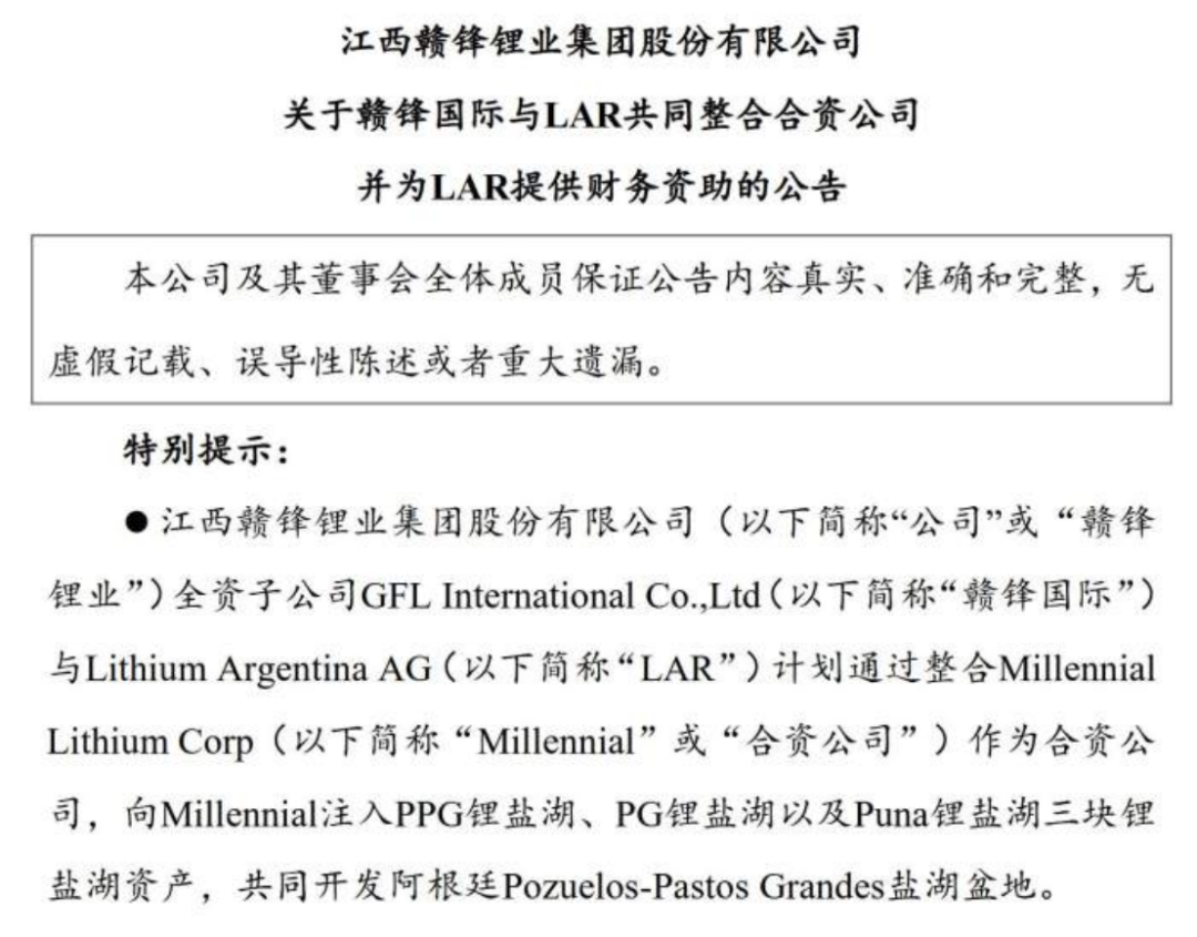 按照公告顯示,贛鋒鋰業(yè)全資子公司贛鋒國際將全資持有的PPG鋰鹽湖項目、與LAR雙方共同持有的PG鋰鹽湖項目(贛鋒鋰業(yè)持有14.89%股權(quán),LAR持有85.11%股權(quán))及Puna鋰鹽湖項目(贛鋒鋰業(yè)持有35%股權(quán),LAR持有65%股權(quán))整合至LAR的全資子公司Millennial旗下,三個鋰鹽湖項目區(qū)域位置接近,是著名的“鋰三角”地區(qū)的一部分,通過整合能夠更進(jìn)一步地降低成本,做相應(yīng)開發(fā)。