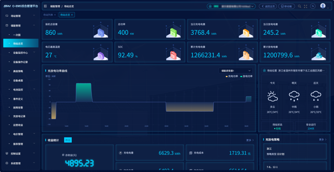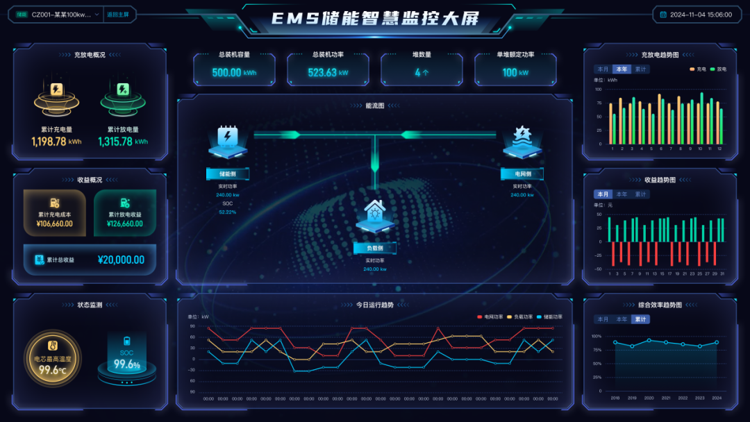 在功能層面,該系統(tǒng)集成了 SCADA、圖模庫一體化、拓?fù)浞治?、資產(chǎn)管理、BMS 與 PCS 監(jiān)測(cè)控制、大數(shù)據(jù)分析、收益計(jì)算、電價(jià)管理、遠(yuǎn)程運(yùn)維等核心功能。針對(duì)不同應(yīng)用場景,能夠?qū)崿F(xiàn)逆功率控制、負(fù)荷隨動(dòng)、需量控制、光伏最大消納、削峰填谷、需求側(cè)響應(yīng)、碳排放優(yōu)化等多優(yōu)化運(yùn)行目標(biāo),并支持集中遙控、功率平衡、安穩(wěn)控制、并離網(wǎng)切換、黑啟動(dòng)等多種運(yùn)行控制方式。此外,系統(tǒng)配備的智能運(yùn)維管理模塊,具備測(cè)點(diǎn)設(shè)備監(jiān)控、歷史數(shù)據(jù)分析、故障診斷恢復(fù)功能,可實(shí)現(xiàn) EMS/BMS/PCS 一站式運(yùn)維,有效提升運(yùn)維效率。