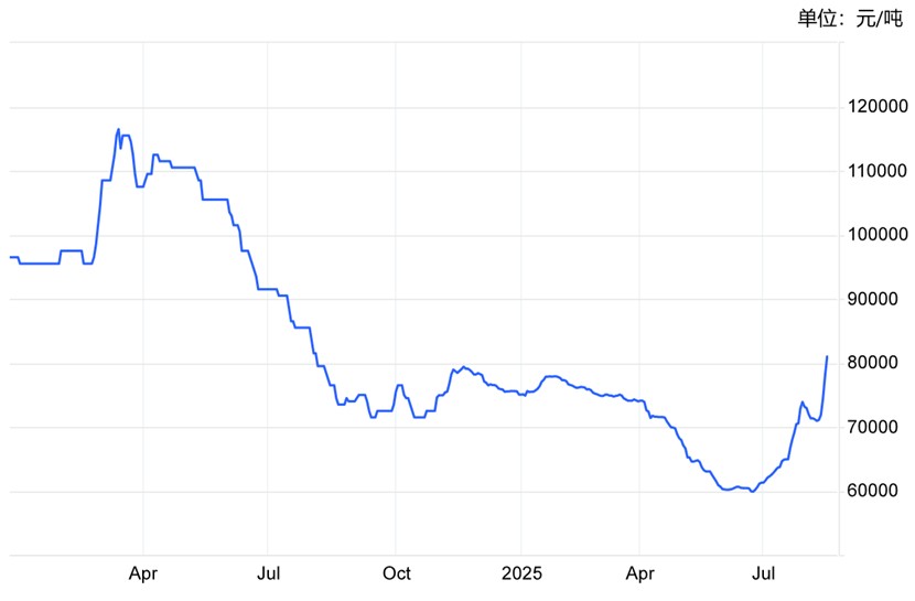 在市場(chǎng)爆單和產(chǎn)能擴(kuò)張的同時(shí),8月11日-8月13日,電池級(jí)碳酸鋰均價(jià)連續(xù)暴漲,單日暴漲超3000元/噸,目前已突破8萬(wàn)元/噸。截至8月13日,電池級(jí)碳酸鋰均價(jià)漲至8.1萬(wàn)元/噸,創(chuàng)2024年8月以來(lái)近一年的價(jià)格最高記錄。