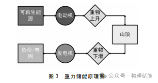 重力儲能系統(tǒng)(GBES)的介質(zhì)主要分為水和固體物質(zhì),是由重力產(chǎn)生的位能來儲存能源。當(dāng)電力低負(fù)荷時利用多余電量,將重物吊至高處產(chǎn)生重力勢能,在需要電力的時候,再利用重物下降的力量來驅(qū)動發(fā)電機(jī)發(fā)電,具體原理如圖3所示[9]。