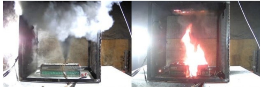 圖2 UL研究所進行的鋰離子電池濫用/點火測試,其中左側(cè)是電池冒煙,右側(cè)是電池燃燒