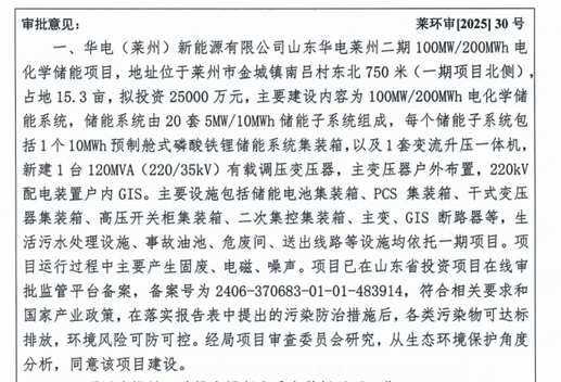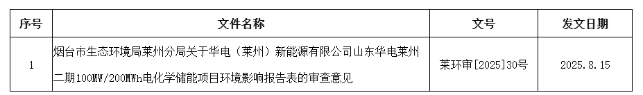 中國(guó)儲(chǔ)能網(wǎng)訊:8月18日,山東煙臺(tái)市生態(tài)環(huán)境局萊州分局公告,關(guān)于華電(萊州)新能源有限公司山東華電萊州二期100MW/200MWh電化學(xué)儲(chǔ)能項(xiàng)目環(huán)境影響報(bào)告表的審查意見(jiàn)。