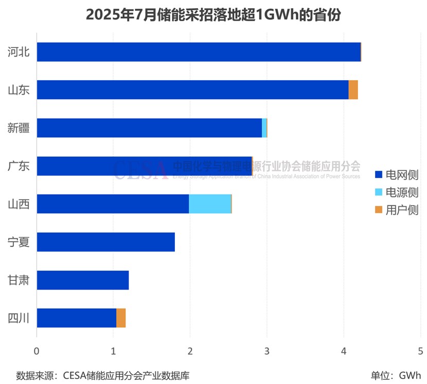 從區(qū)域分布上來看,7月河北、山東儲(chǔ)能采招落地規(guī)模均超過4GWh,領(lǐng)跑全國(guó)。