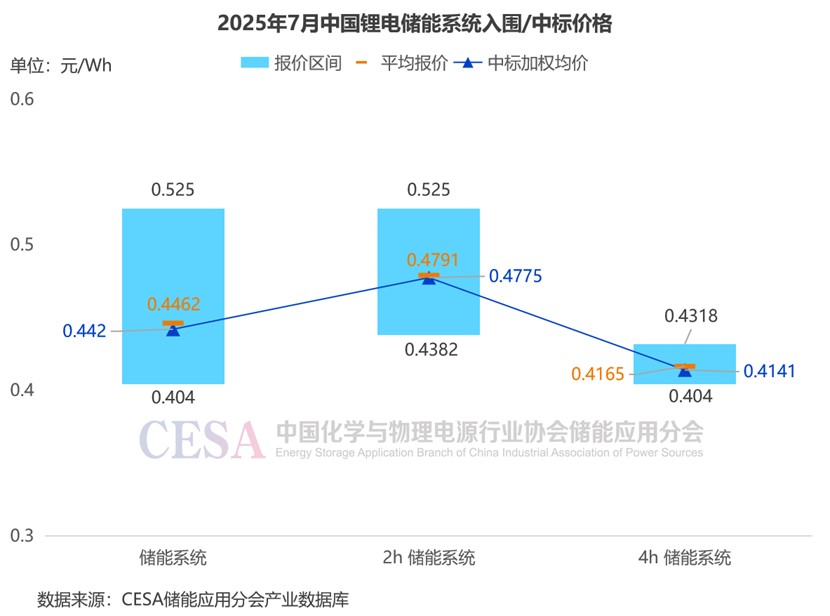 7月4h鋰電儲(chǔ)能系統(tǒng)入圍報(bào)價(jià)主要集中在0.404-0.4318元/Wh,平均報(bào)價(jià)0.4165元/Wh,中標(biāo)加權(quán)均價(jià)0.4141元/Wh,創(chuàng)4h鋰電儲(chǔ)能系統(tǒng)月度均價(jià)最低。最低報(bào)價(jià)來自于國(guó)華投資國(guó)能蒙東莫旗風(fēng)電基地項(xiàng)目?jī)?chǔ)能設(shè)備采購(gòu),中車株洲所以0.404元/Wh的報(bào)價(jià)入圍成為第二中標(biāo)候選人,創(chuàng)當(dāng)時(shí)入圍最低價(jià)新低,直至這個(gè)紀(jì)錄在2025年8月在中國(guó)能建2025年度磷酸鐵鋰電池儲(chǔ)能系統(tǒng)集中采購(gòu)項(xiàng)目中,被安誠(chéng)新能源、鵬程無限、晶科能源、平高儲(chǔ)能、同啟新能源、精控能源等企業(yè)≤0.4元/Wh的入圍報(bào)價(jià)打破。