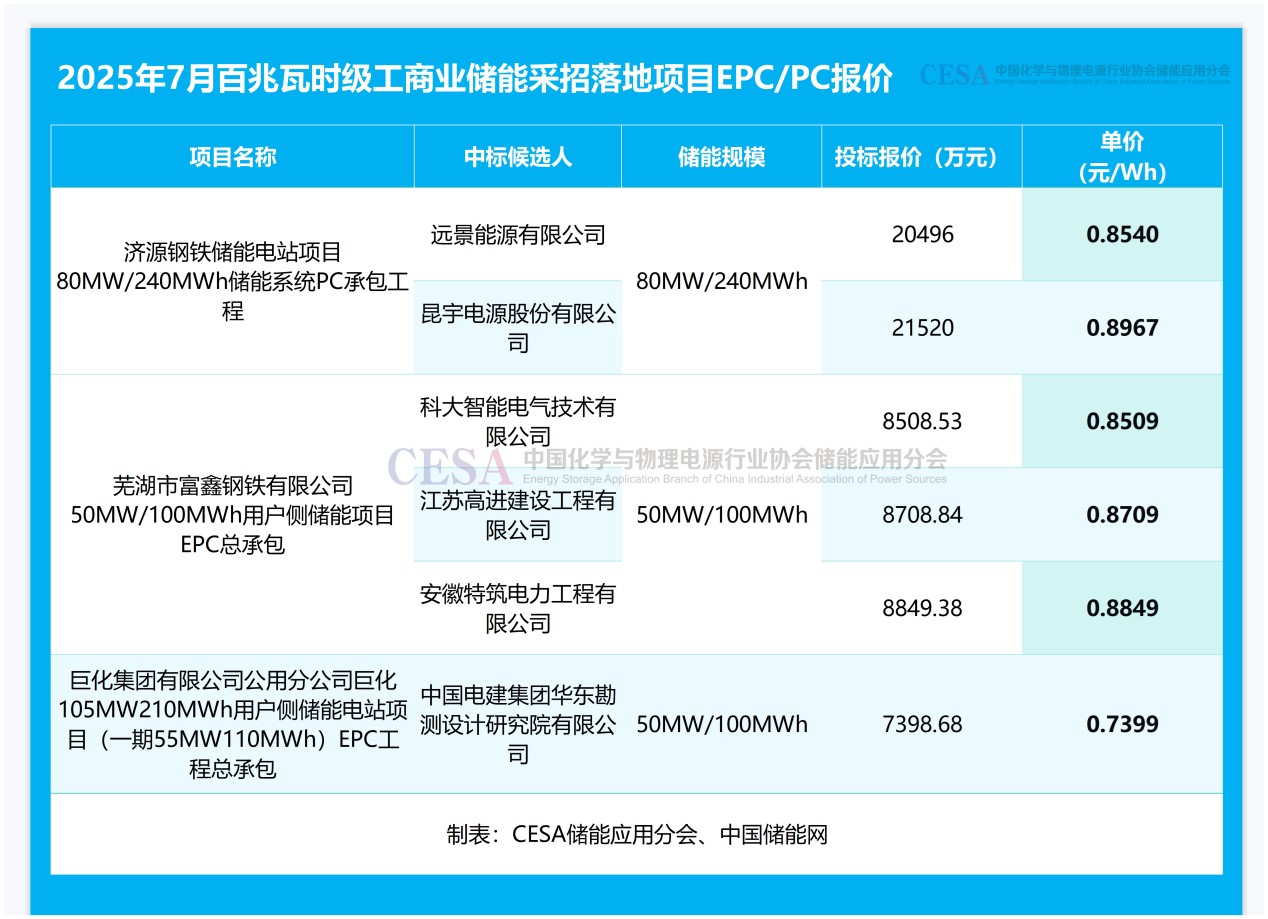據(jù)CESA儲(chǔ)能應(yīng)用分會(huì)產(chǎn)業(yè)數(shù)據(jù)庫不完全統(tǒng)計(jì),2025年7月,工商業(yè)儲(chǔ)能項(xiàng)目鋰電EPC/PC總承包價(jià)格主要集中在0.7399-1.5308元/Wh區(qū)間內(nèi),平均報(bào)價(jià)1.0622元/Wh,中標(biāo)加權(quán)均價(jià)0.8492元/Wh,環(huán)比下降20.08%。主要原因是7月多個(gè)百兆瓦時(shí)級(jí)工商儲(chǔ)項(xiàng)目采招落地,直接拉低了月度中標(biāo)加權(quán)均價(jià),詳情見下表。
