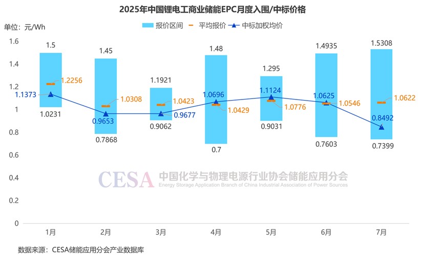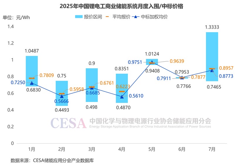 2025年7月,工商業(yè)儲(chǔ)能系統(tǒng)總承包價(jià)格主要集中在0.7465-1.3333元/Wh區(qū)間內(nèi),平均報(bào)價(jià)0.8957元/Wh,中標(biāo)加權(quán)均價(jià)0.8773元/Wh,環(huán)比+10.90%。