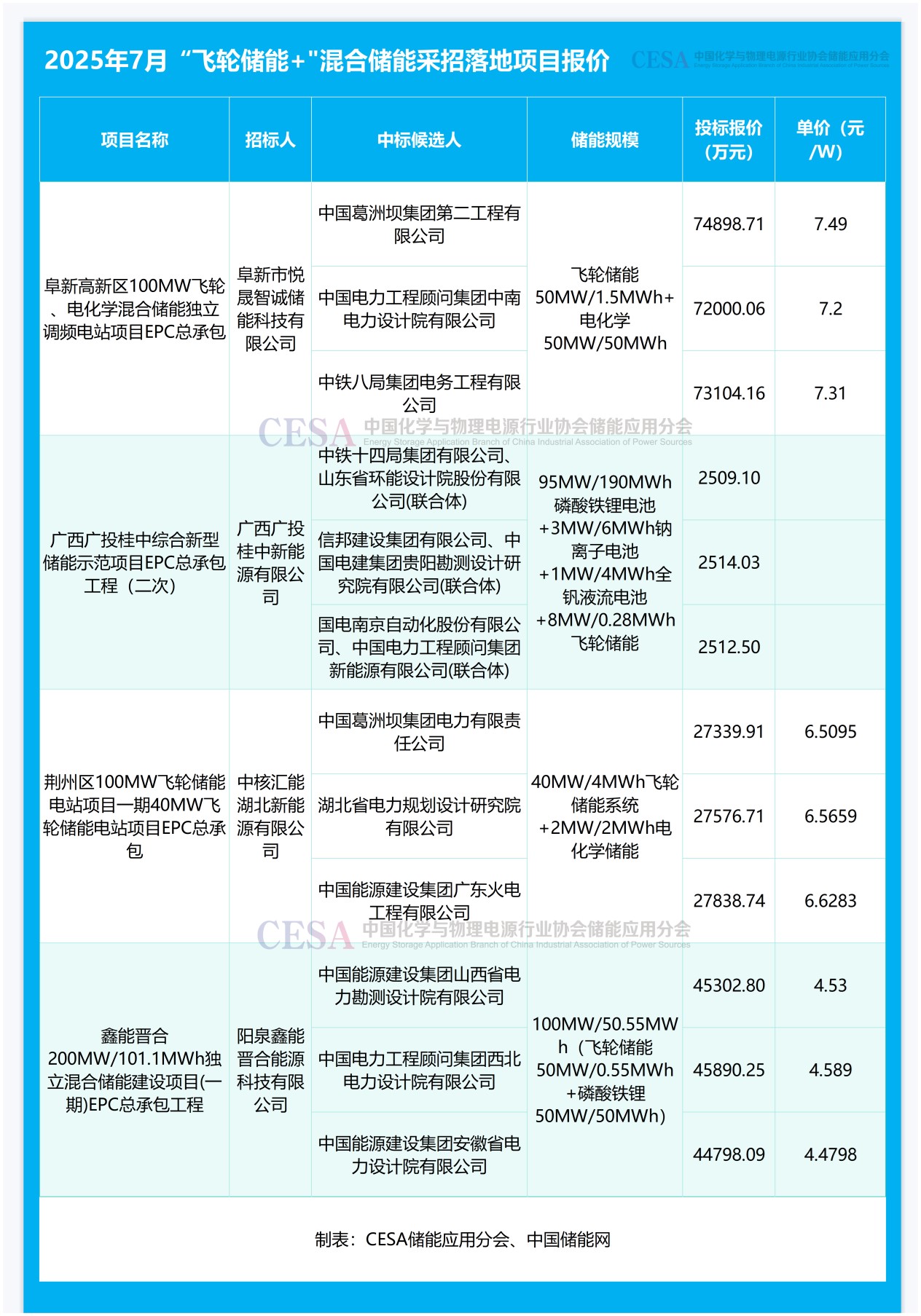 值得一提的是,7月共11個(gè)混合儲(chǔ)能項(xiàng)目采招落地,總規(guī)模659MW/1026MWh,占比6.84%(功率)/3.81%(容量)。其中包括4個(gè)“飛輪儲(chǔ)能+”混合儲(chǔ)能項(xiàng)目,詳情見下表。