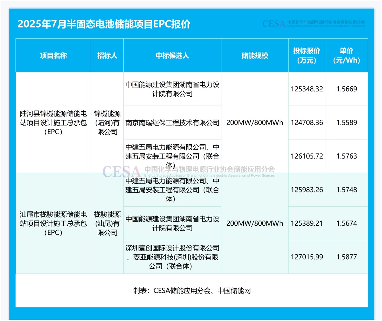 中能建湖南院以12.53億元的報(bào)價(jià)中標(biāo)陸河縣錦樾能源儲(chǔ)能電站項(xiàng)目設(shè)計(jì)施工總承包(EPC),折合單價(jià)1.5669元/Wh。