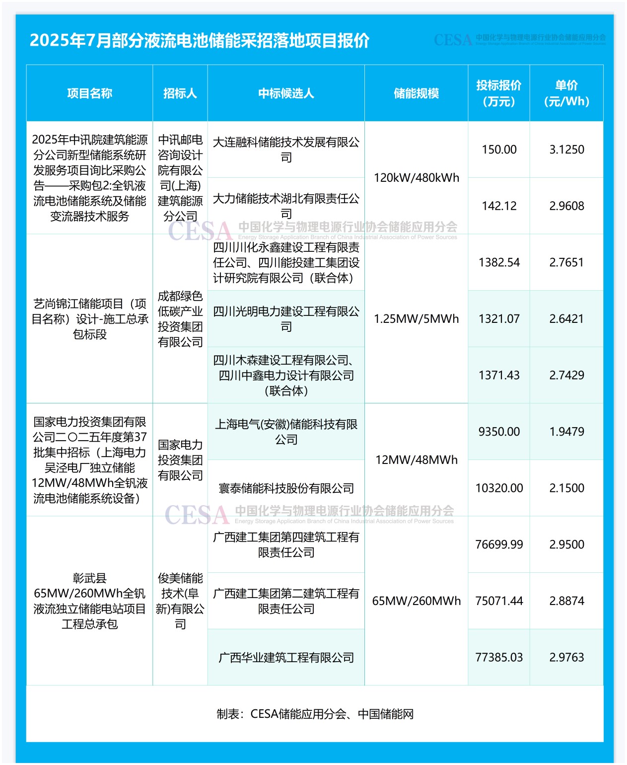 四川川化永鑫建設(shè)工程有限責(zé)任公司、四川能投建工集團(tuán)設(shè)計(jì)研究院有限公司以1382.53851萬元的報(bào)價(jià)聯(lián)合中標(biāo)四川成都藝尚錦江儲(chǔ)能項(xiàng)目EPC,折合單價(jià)2.7651元/Wh。