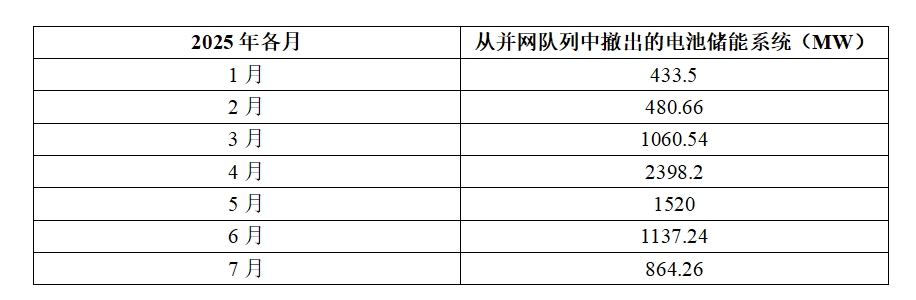 下表展示了2025年各月從ERCOT并網(wǎng)隊(duì)列中撤出電池儲(chǔ)能系統(tǒng),可以看出4月出現(xiàn)了一個(gè)高峰,隨后每月逐漸下降,直至7月。
