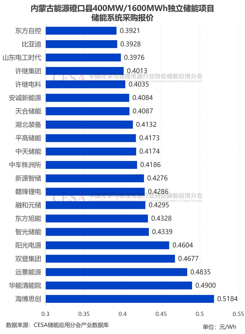 標(biāo)段二共吸引了比亞迪、山東電工時(shí)代、平高儲(chǔ)能、智光儲(chǔ)能、融和元儲(chǔ)、陽光電源、遠(yuǎn)景能源、許繼電科等21家企業(yè)角逐,投標(biāo)報(bào)價(jià)在0.3921-0.5184元/Wh,平均報(bào)價(jià)0.4306元/Wh。最低報(bào)價(jià)0.3921元/Wh來自于東方自控,最高報(bào)價(jià)0.5184元/Wh來自于海博思創(chuàng)。