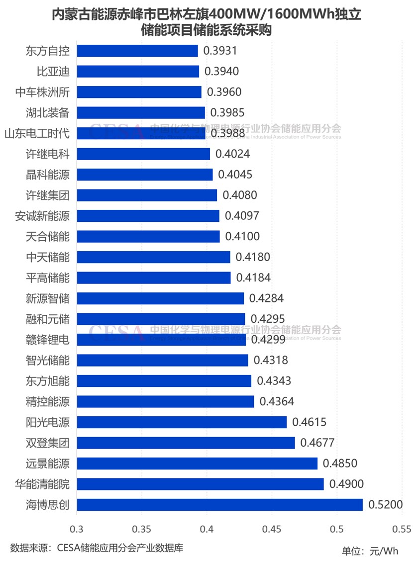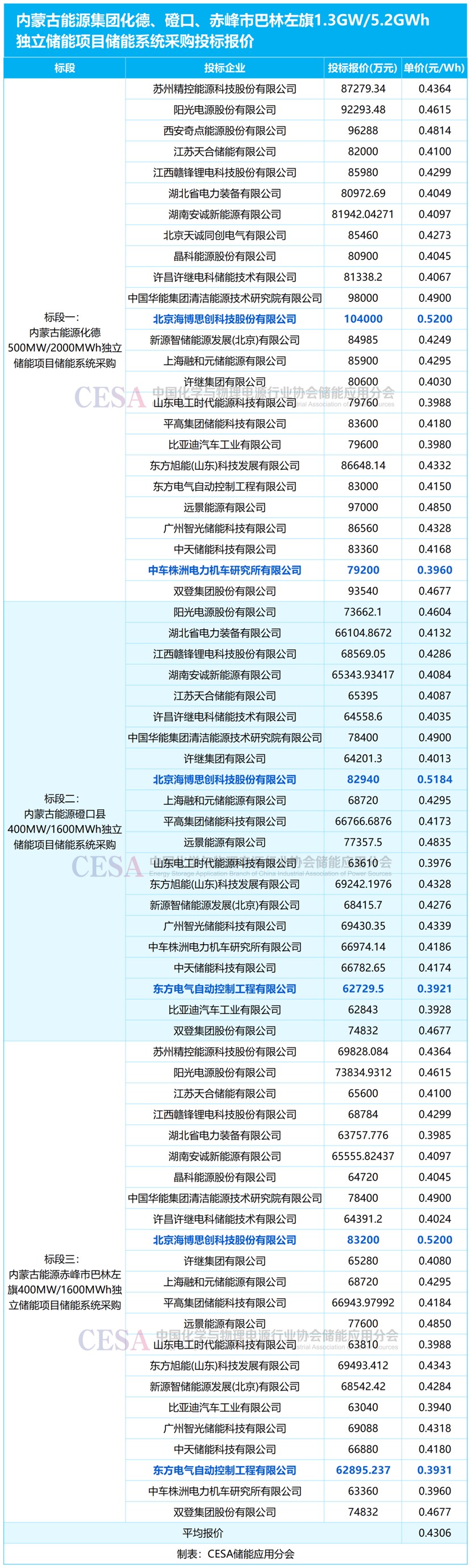 標(biāo)段三共吸引了東方自控、比亞迪、中車株洲所、湖北裝備、晶科能源等23家企業(yè)競標(biāo),投標(biāo)報(bào)價(jià)在0.3931-0.52元/Wh,平均報(bào)價(jià)0.429元/Wh。最低報(bào)價(jià)0.3931元/Wh來自于東方自控,最高報(bào)價(jià)0.52元/Wh來自于海博思創(chuàng)。