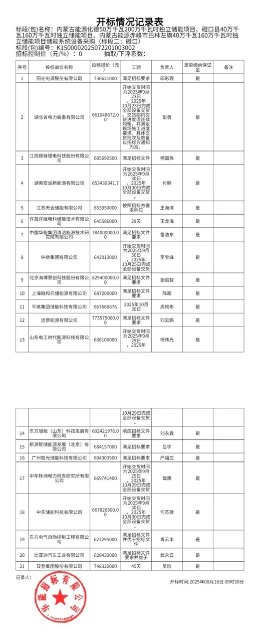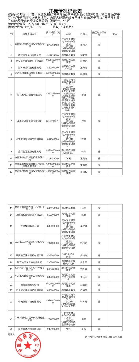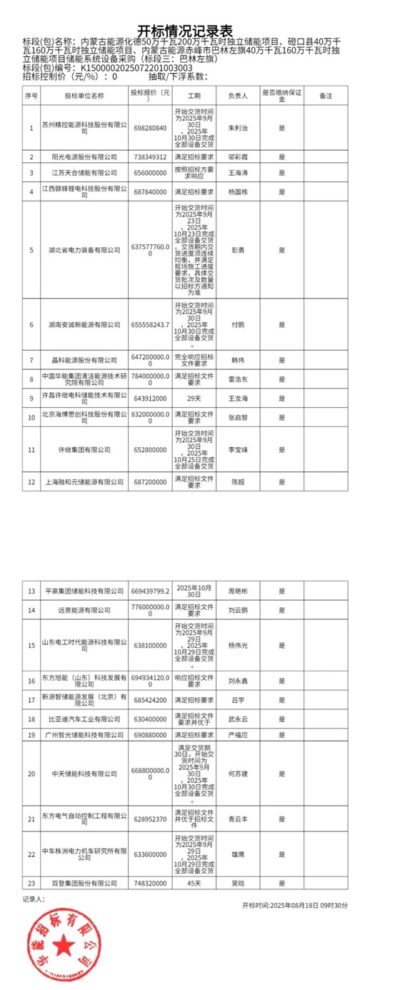 中國儲(chǔ)能網(wǎng)訊:2025年8月18日,內(nèi)蒙古能源化德50萬千瓦200萬千瓦時(shí)獨(dú)立儲(chǔ)能項(xiàng)目、磴口縣40萬千瓦160萬千瓦時(shí)獨(dú)立儲(chǔ)能項(xiàng)目、內(nèi)蒙古能源赤峰市巴林左旗40萬千瓦160萬千瓦時(shí)獨(dú)立儲(chǔ)能項(xiàng)目儲(chǔ)能系統(tǒng)設(shè)備采購開標(biāo)。