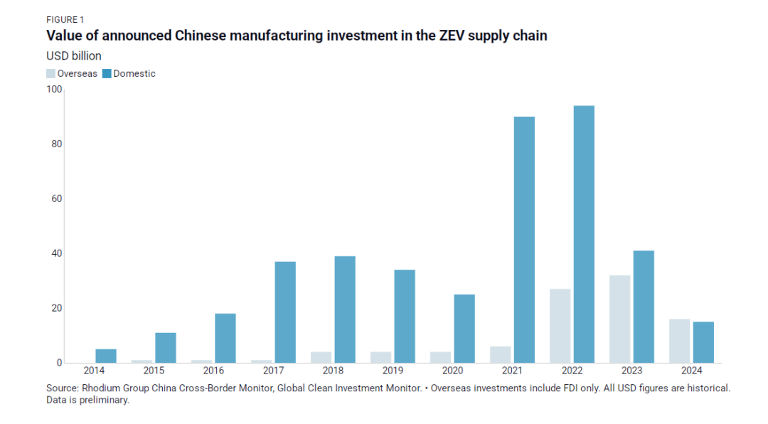近日,咨詢公司榮鼎集團(tuán)(Rhodium Group)發(fā)布一份研究報(bào)告顯示,2024年,中國電動(dòng)汽車產(chǎn)業(yè)鏈企業(yè)海外投資約為160億美元,略高于國內(nèi)150億美元的投資規(guī)模。這也是自2014年有記錄以來,中國電動(dòng)汽車產(chǎn)業(yè)鏈企業(yè)的海外投資首次超過國內(nèi)投資。