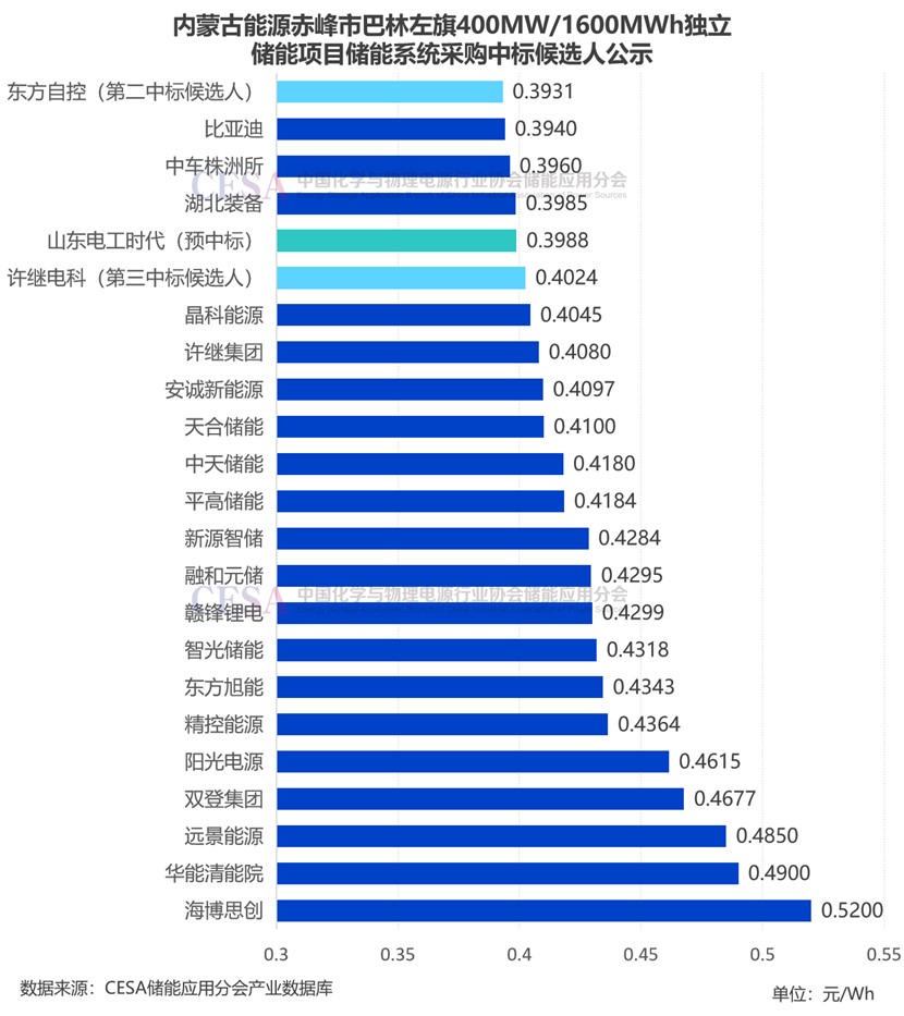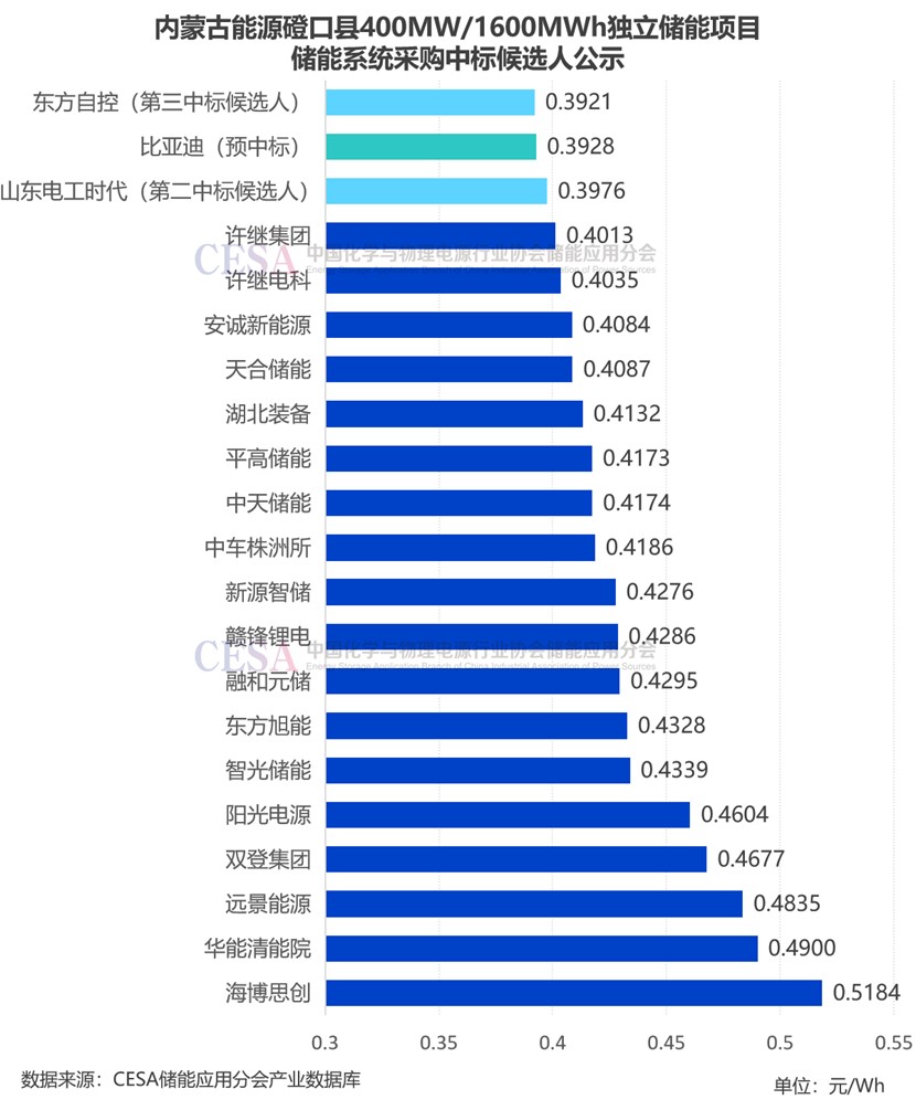 該標(biāo)段共吸引了21家企業(yè)角逐,投標(biāo)報(bào)價(jià)在0.3921-0.5184元/Wh,平均報(bào)價(jià)0.4306元/Wh。比亞迪以62843萬(wàn)元的報(bào)價(jià)預(yù)中標(biāo),折合單價(jià)0.3928元/Wh。山東電工時(shí)代、東方自控入圍成為第二、第三中標(biāo)候選人。