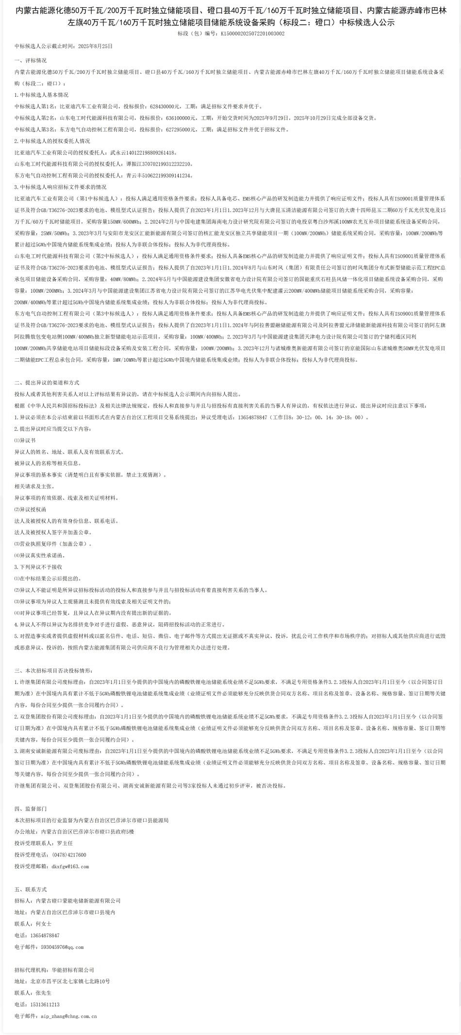 中國(guó)儲(chǔ)能網(wǎng)訊:2025年8月21日,內(nèi)蒙古能源化德50萬(wàn)千瓦/200萬(wàn)千瓦時(shí)獨(dú)立儲(chǔ)能項(xiàng)目、磴口縣40萬(wàn)千瓦/160萬(wàn)千瓦時(shí)獨(dú)立儲(chǔ)能項(xiàng)目、內(nèi)蒙古能源赤峰市巴林左旗40萬(wàn)千瓦/160萬(wàn)千瓦時(shí)獨(dú)立儲(chǔ)能項(xiàng)目?jī)?chǔ)能系統(tǒng)設(shè)備采購(gòu)中標(biāo)候選人公示。