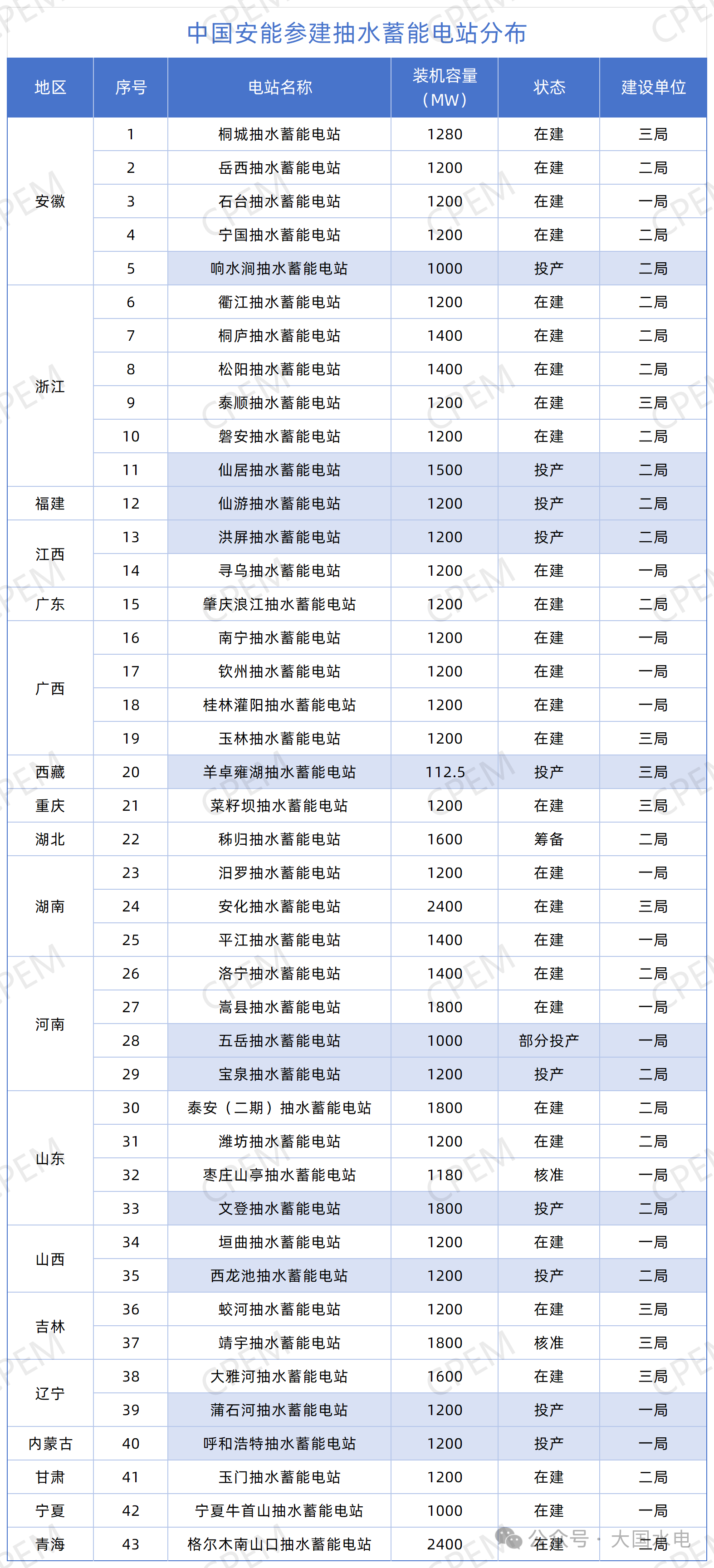 據(jù)CPEM大國水電統(tǒng)計,截至2025年8月11日,中國安能參建/即將參建抽水蓄能電站43座,包括已投產(chǎn)/部分投產(chǎn)抽水蓄能電站11座,在建抽水蓄能電站29座,核準/籌備抽水蓄能電站3座,如下: