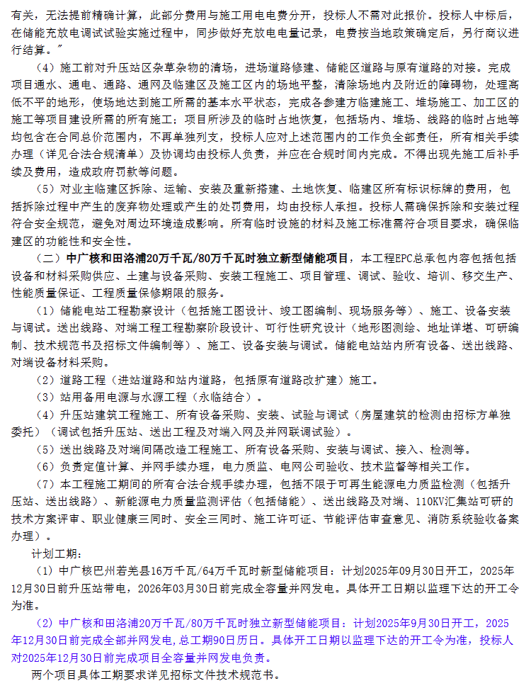中廣核和田洛浦200MW/800MWh獨(dú)立新型儲能項(xiàng)目位于新疆和田地區(qū)洛浦縣境內(nèi),距洛浦縣約20公里,擬建設(shè)集中式電化學(xué)儲能電站。計(jì)劃2025年9月30日開工,2025年12月30日前完成全部并網(wǎng)發(fā)電,總工期90日歷日。投標(biāo)人對2025年12月30日前完成項(xiàng)目全容量并網(wǎng)發(fā)電負(fù)責(zé)。