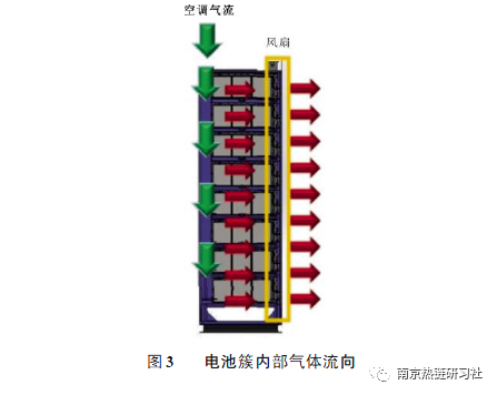 圖3所示為電池簇內(nèi)部氣體流向,空調(diào)輸出的氣流經(jīng)風(fēng)道出口以一定的速度向下流出后,在電池模塊前端面板風(fēng)扇的作用下,從電池模塊后端面板進(jìn)風(fēng)口進(jìn)入電池模塊內(nèi)部,流經(jīng)電池單體表面對(duì)電池單體降溫,然后由風(fēng)扇抽出。