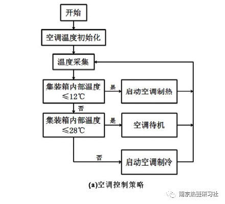 空調(diào)控制由空調(diào)自身邏輯控制來(lái)實(shí)現(xiàn),根據(jù)集裝箱內(nèi)部不同溫度條件可分為制熱模式和制冷模式,制熱模式實(shí)現(xiàn)對(duì)電池低溫下的控制和保護(hù),制冷模式實(shí)現(xiàn)對(duì)電池溫升的有效控制。當(dāng)集裝箱內(nèi)部溫度低于12℃時(shí),空調(diào)制熱功能開啟;當(dāng)集裝箱內(nèi)部溫度高于28℃時(shí),空調(diào)制冷功能開啟。